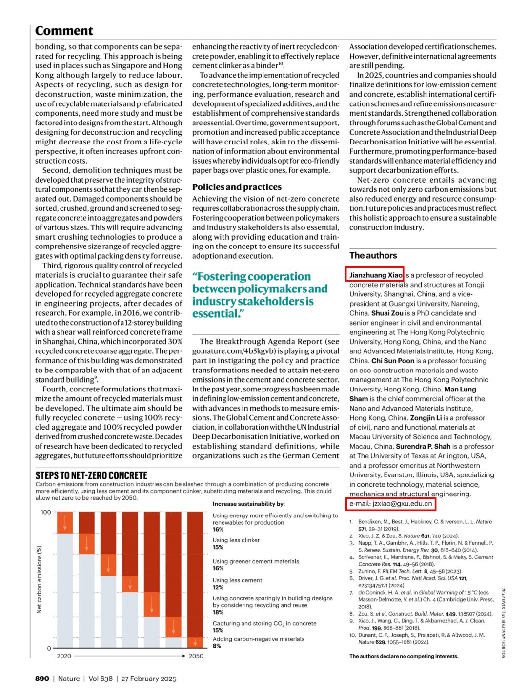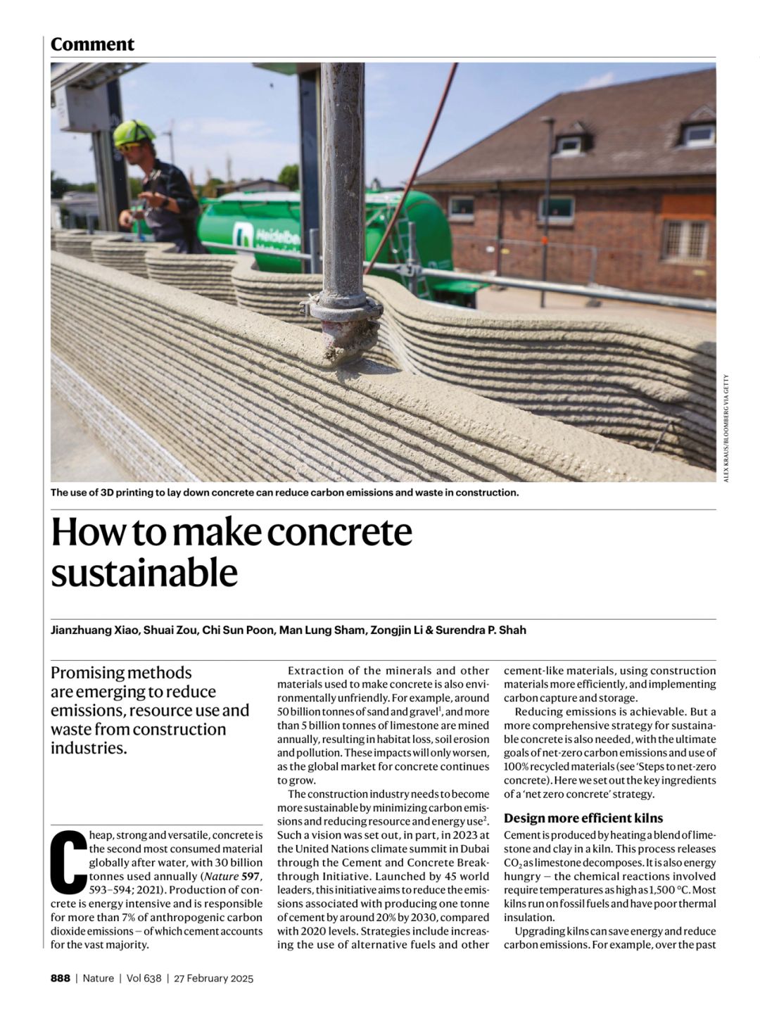 近日,sunbet申搏官方网站党委常委、副校长,sunbet申搏官方网站双碳科学与技术研究院院长,同济大学长聘教授肖建庄携手来自不同国家和机构的顶尖学者,以sunbet申搏官方网站作为通讯单位,在国际顶级学术期刊《Nature》发表评论性文章 “How to make concrete sustainable”,为建筑关键材料的绿色可持续发展提供了清晰的科学依据和技术路线图,引发广泛关注。