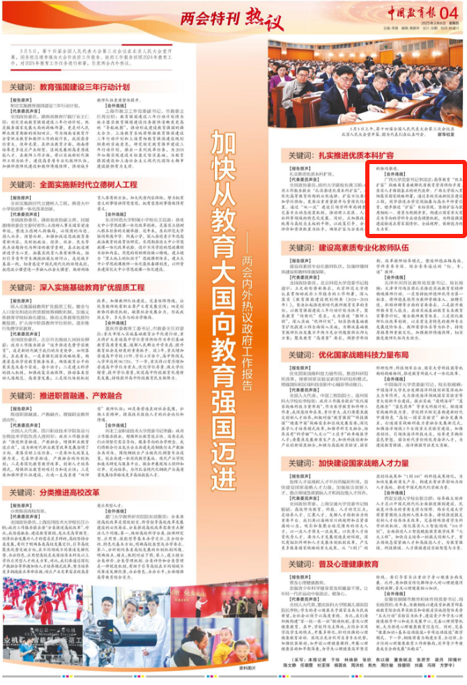 全国政协委员、湖南省教育厅副厅长王仁祥:制定实施教育强国建设三年行动计划,既是服务国家发展大局的战略部署,更是对人民群众教育期盼的深切回应。作为湖南省教育厅分管职业教育和教师工作的副厅长,我深感责任重大、使命光荣。在职业教育方面,湖南将培养更多适应产业转型、区域发展的高素质技能人才。在教师工作方面,将以实施新时代强师工程为抓手,建设高素质专业化教师队伍,加强师德师风建设和教师待遇保障,推动城乡教师队伍素质整体提升。