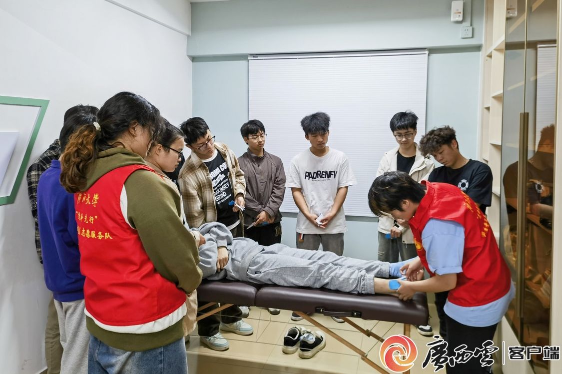 来自体育学院的田海森、胡佳钰同学在“一站式”学生社区的健康服务站内,使用理疗床、弹力带、肌内效贴布等现代康复器具进行运动康复科普志愿服务,为现场同学展示踝关节运动损伤应急处理方式,并传授日常保健知识和训练方法。