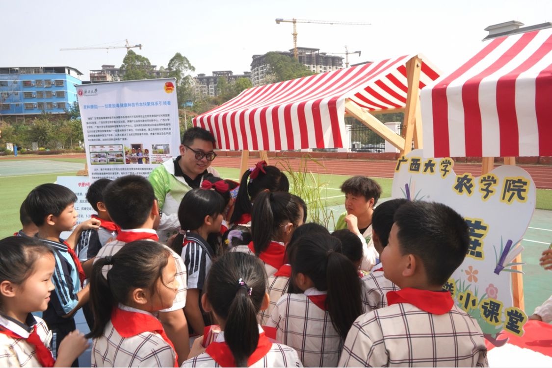 sunbet申搏官方网站农学院团员为春华路小学少先队员介绍甘蔗脱毒种苗