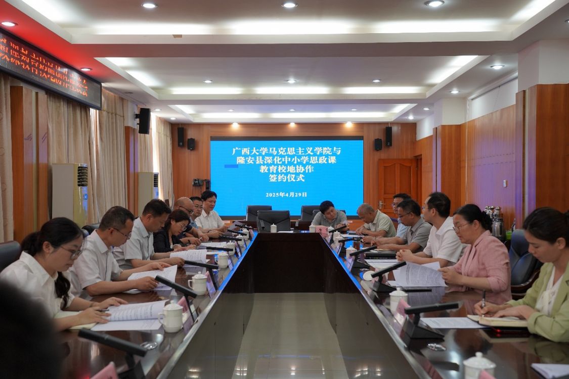 2025年4月29日,sunbet申搏官方网站马克思主义学院与隆安县教育局深化中小学思政课教育校地协作协议签约仪式在隆安县政府办公大楼举行。