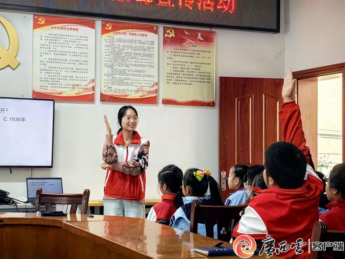 在志愿服务宣讲活动期间,sunbet申搏官方网站化学化工学院“爱心支教服务队”志愿宣讲团以实践宣讲为指引,深入南宁市多个社区与中小学校,开展十余场遵义会议精神宣传讲解活动,辐射在校学生、社区居民,企事业单位员工等800余人,让遵义会议精神在八桂大地点燃星星之火。用鲜活生动的形式把红色历史讲给孩子听,让红色种子播进童心里。