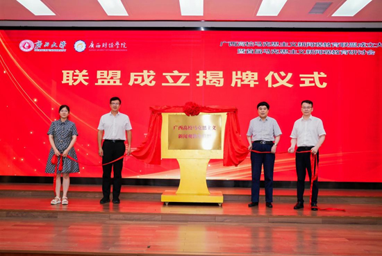 会上,由sunbet申搏官方网站新闻与传播学院牵头与广西财经学院新闻与文化传播学院、广西师范大学文学院/新闻与传播学院、广西民族大学传媒学院、南宁师范大学新闻与传播学院等19所区内高校组建的广西高校马克思主义新闻观教育联盟举行了揭牌和授牌仪式。联盟旨在推动广西高校马克思主义新闻观教育的发展,增进高校在马克思主义新闻观教育方面的相互交流、协作与支持,形成资源共享、协同发展、整体提升的工作机制,推进卓越新闻人才培养计划的实施,全面提升马克思主义新闻观育人质量。