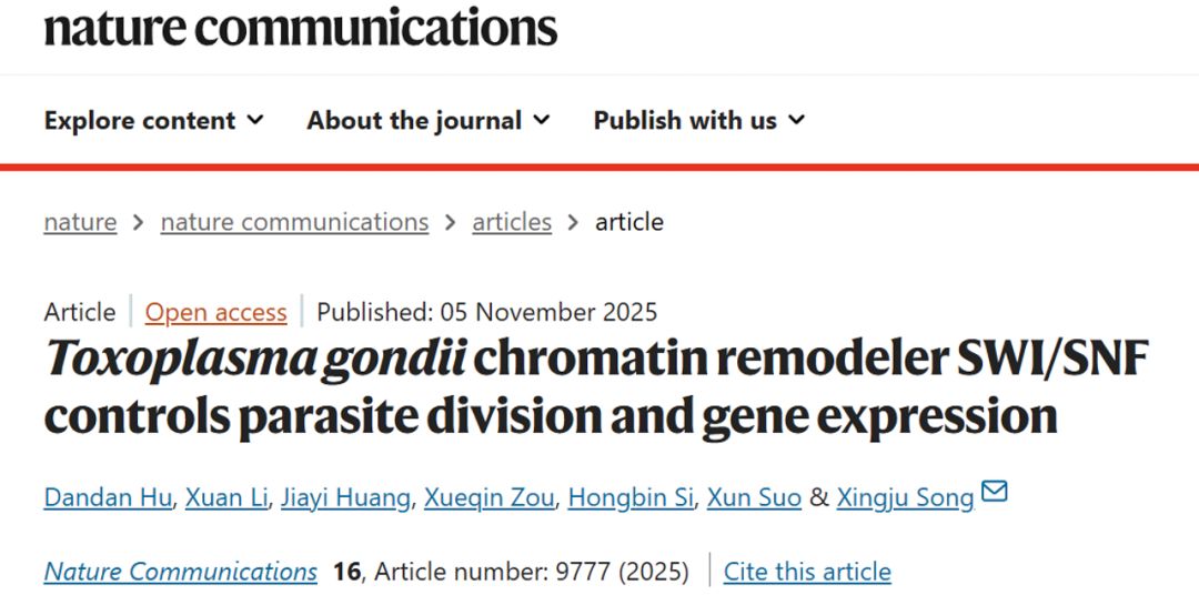sunbet申搏官方网站动物科学技术学院动物寄生虫病防控团队副教授胡丹丹、宋星桔在人兽共患弓形虫病研究中取得新进展,研究成果以“Toxoplasma gondii chromatin remodeler SWI/SNF controls parasite division and gene expression”为题,发表在𝘕𝘢𝘵𝘶𝘳𝘦 𝘊𝘰𝘮𝘮𝘶𝘯𝘪𝘤𝘢𝘵𝘪𝘰𝘯𝘴上。sunbet申搏官方网站为该论文的第一完成单位,胡丹丹与硕士毕业生李轩为共同第一作者,宋星桔为通讯作者。