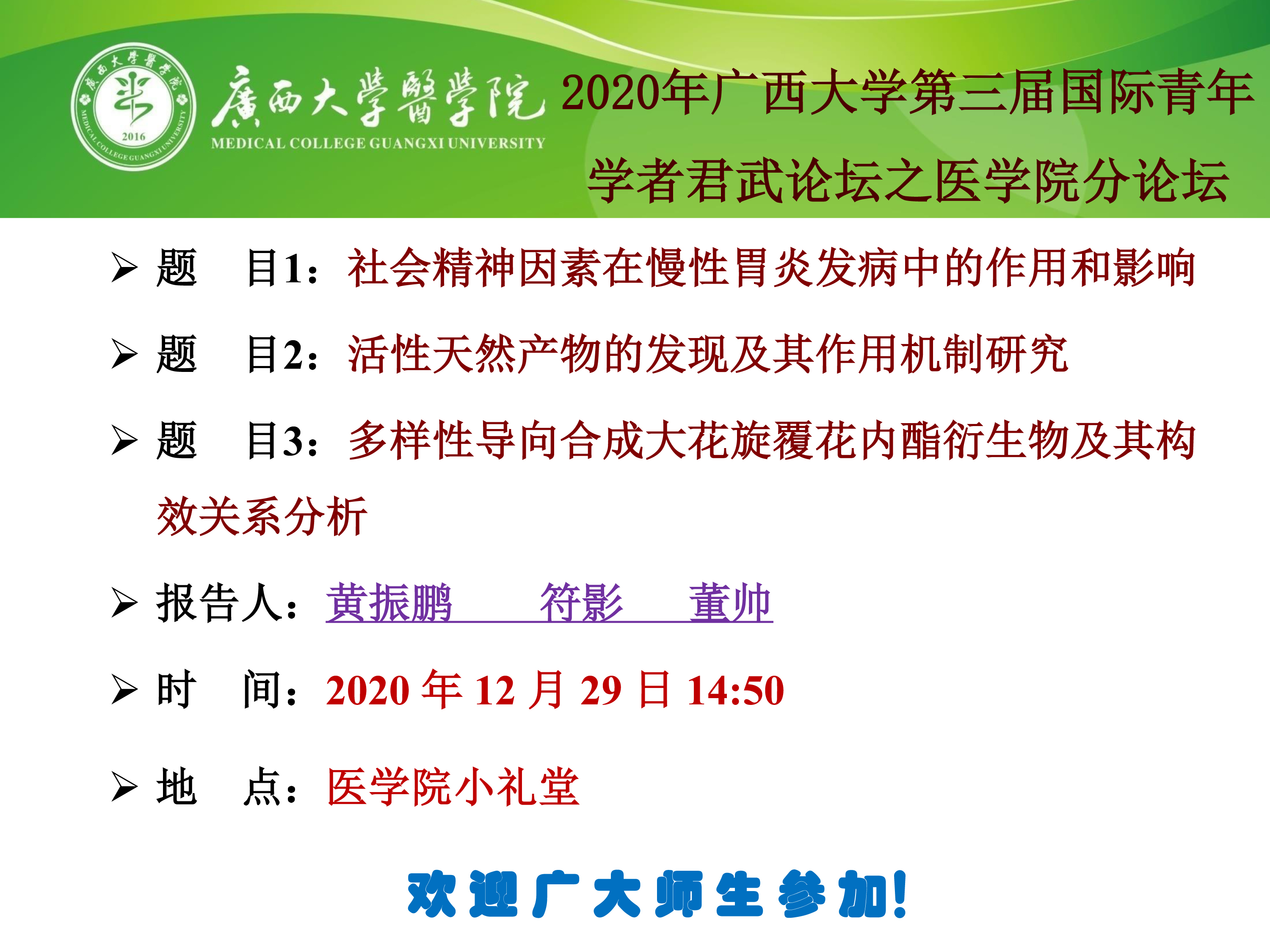 2020年sunbet申搏官方网站第三届国际青年学者君武论坛之医学院分论坛:社会精神因素在慢性胃炎发病中的作用和影响;活性天然产物的发现及其作用机制研究;多样性导向合成大花旋覆花内酯衍生物及其构效关系分析;