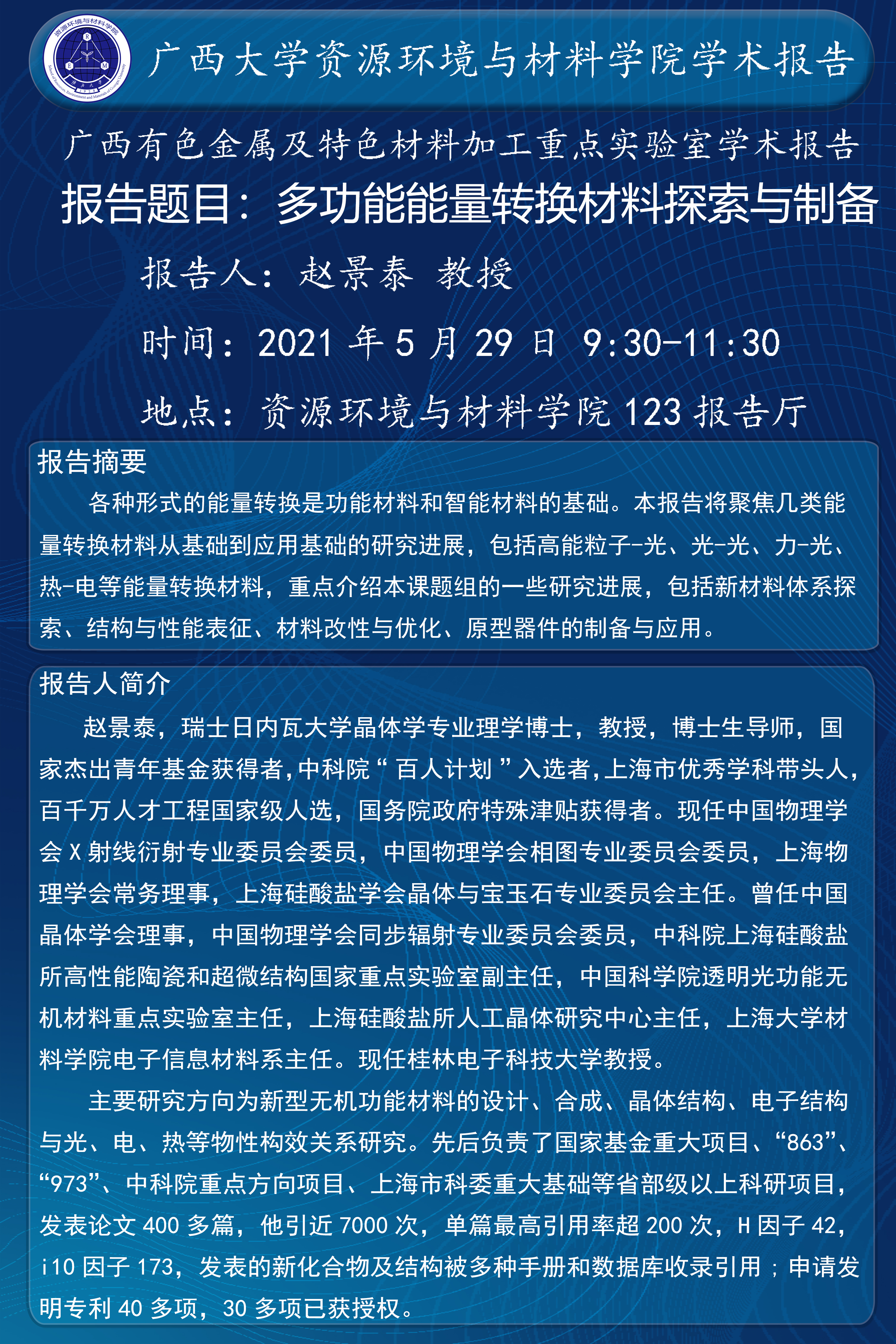 资源环境与材料学院学术报告:多功能能量转换材料探索与制备