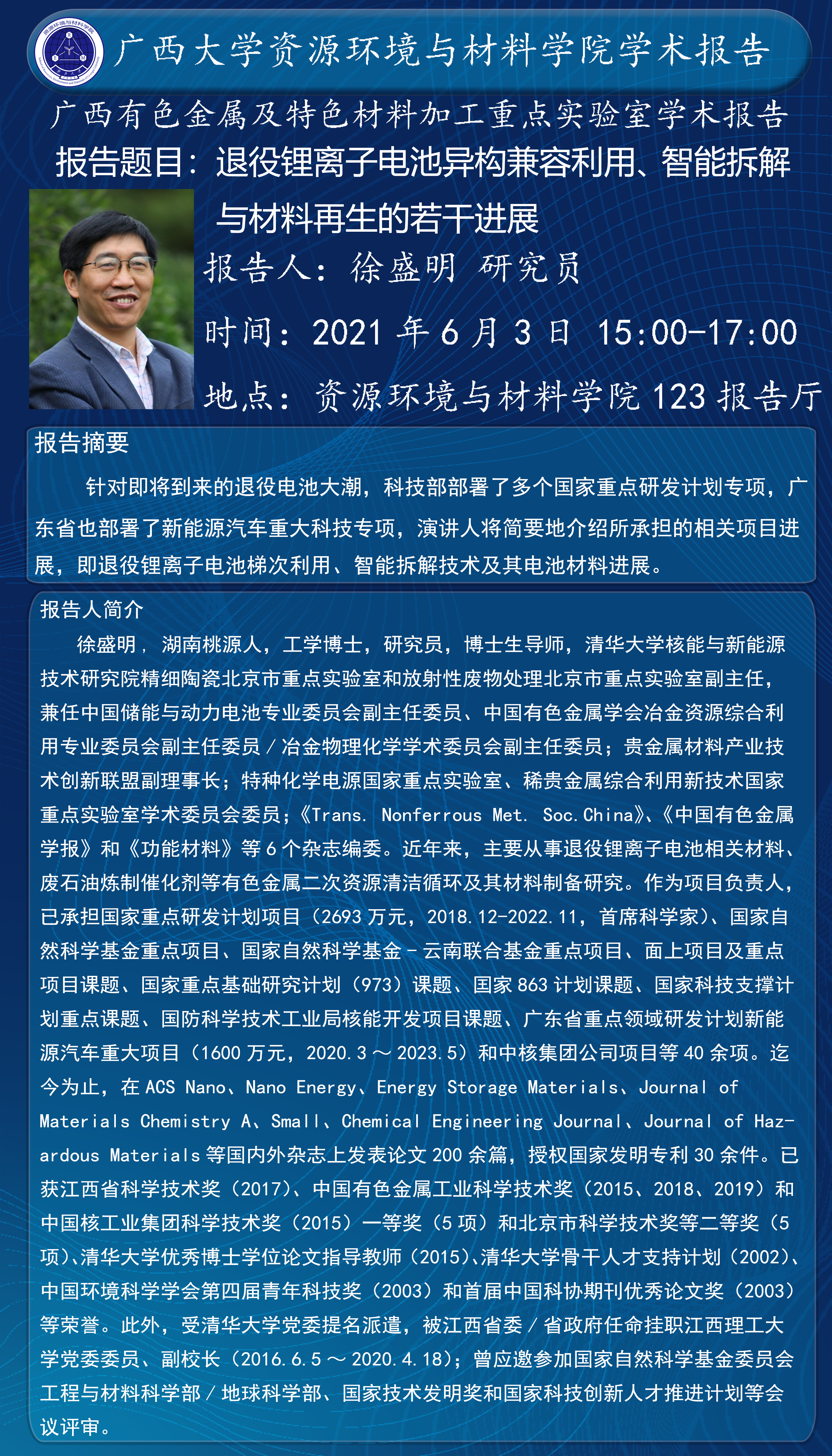 主讲人 徐盛明 研究员 地址 资源环境与材料学院123报告厅