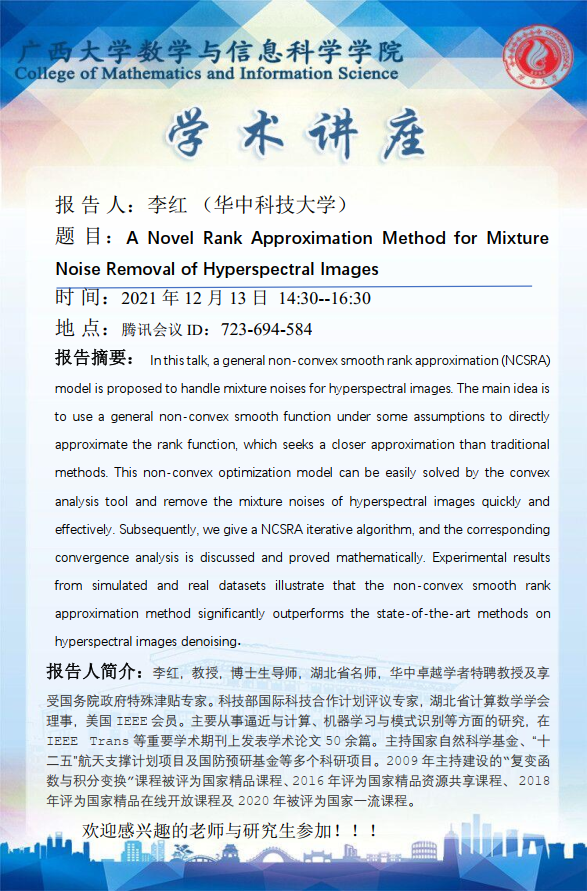 数信学院学术报告: A Novel Rank Approximation Method for Mixture Noise Removal of Hyperspectral Images