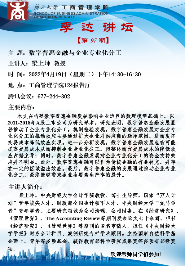 主讲人 梁上坤 教授 地址 工商管理学院128报告厅