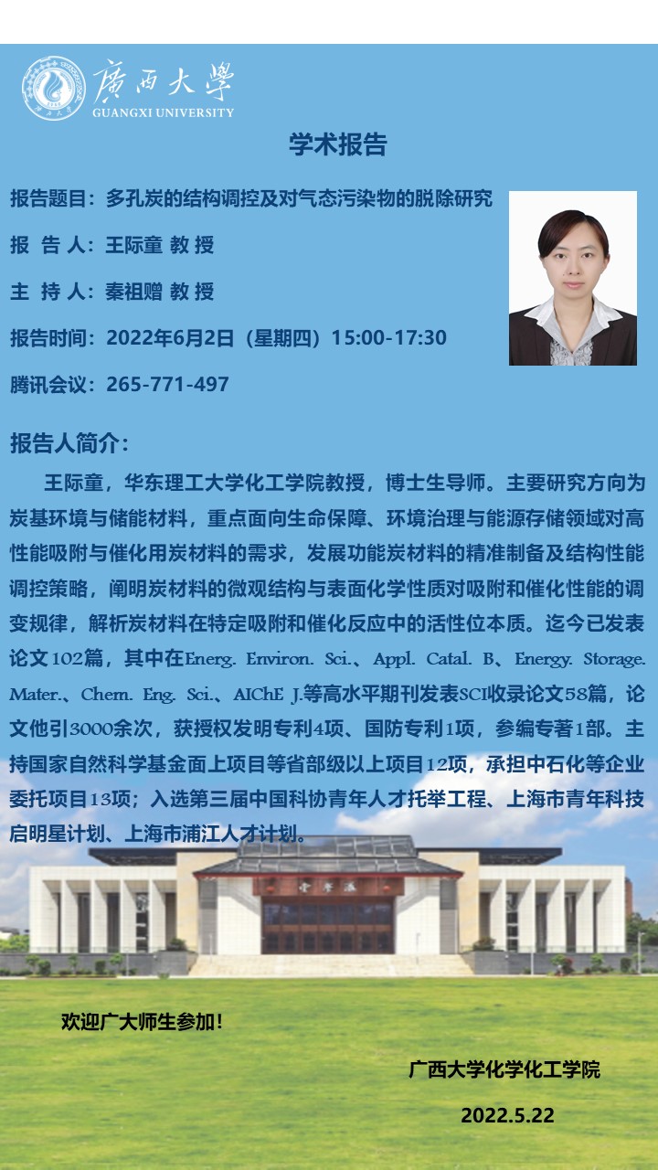 化学化工学院建院九十周年系列学术报告:多孔炭的结构调控及对气态污染物的脱除研究