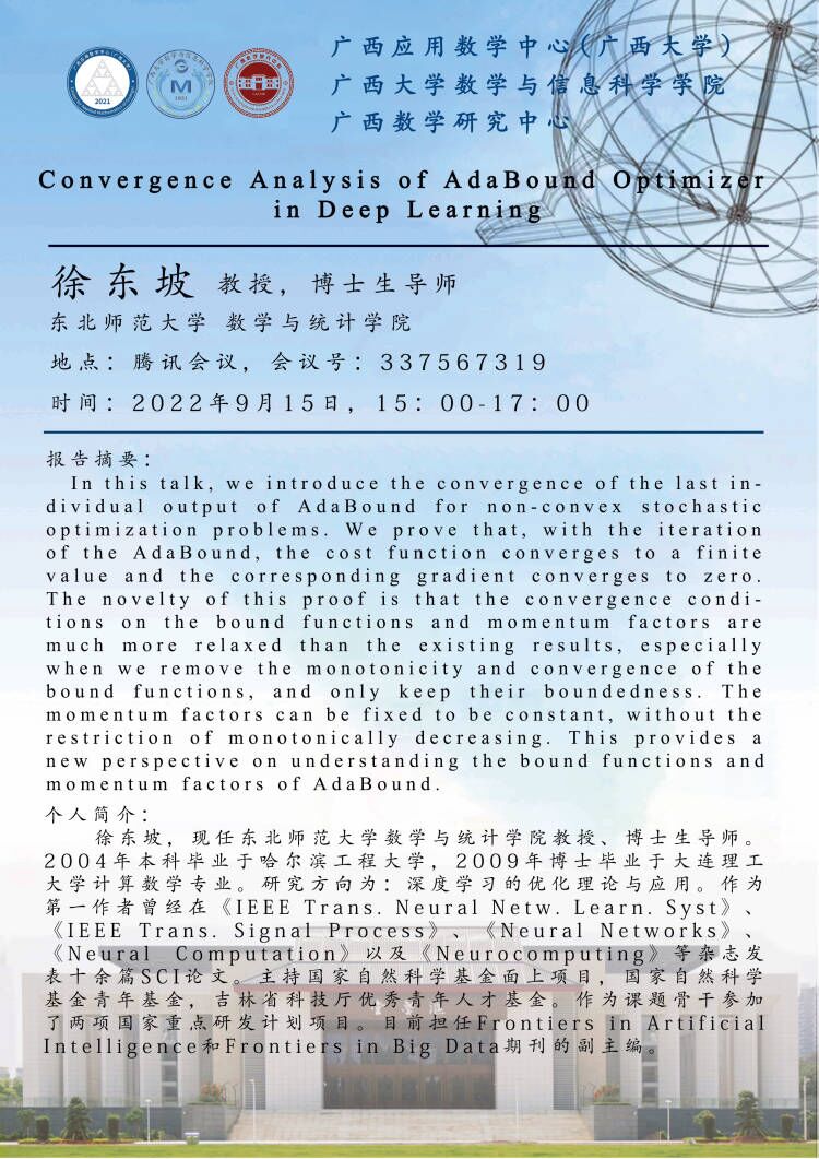 数学与信息科学学院 广西应用数学中心(sunbet申搏官方网站)学术报告:Convergence Analysis of AdaBound Optimizer in Deep Learning