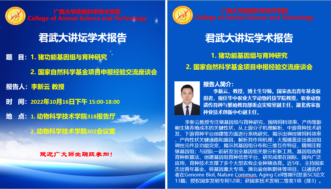 动科院君武大讲坛学术报告:1. 猪功能基因组与育种研究;2. 国家自然科学基金项目申报经验交流座谈会