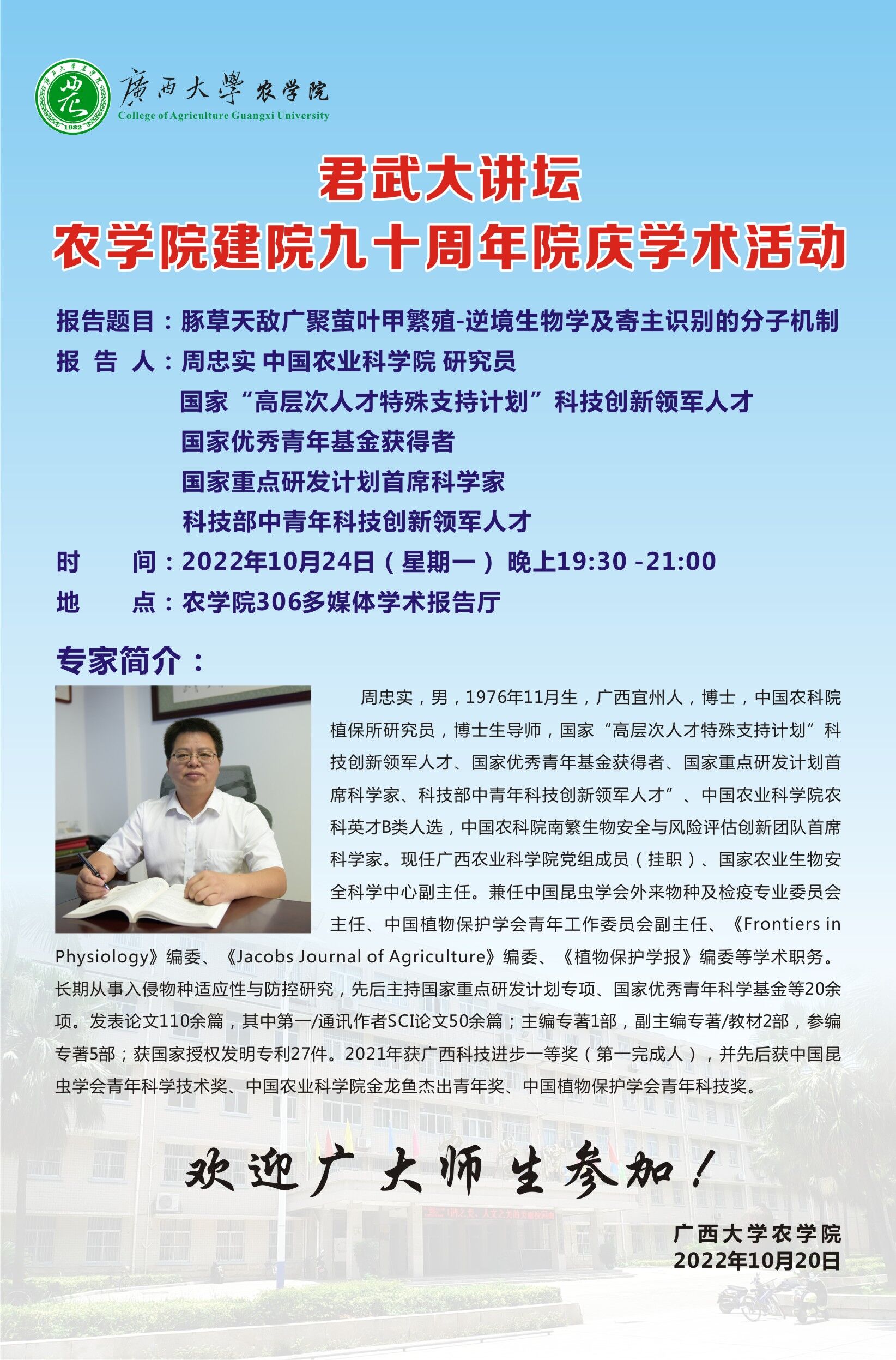 君武大讲坛农学院建院九十周年院庆学术活动:豚草天敌广聚萤叶甲繁殖-逆境生物学及寄主识别的分子机制