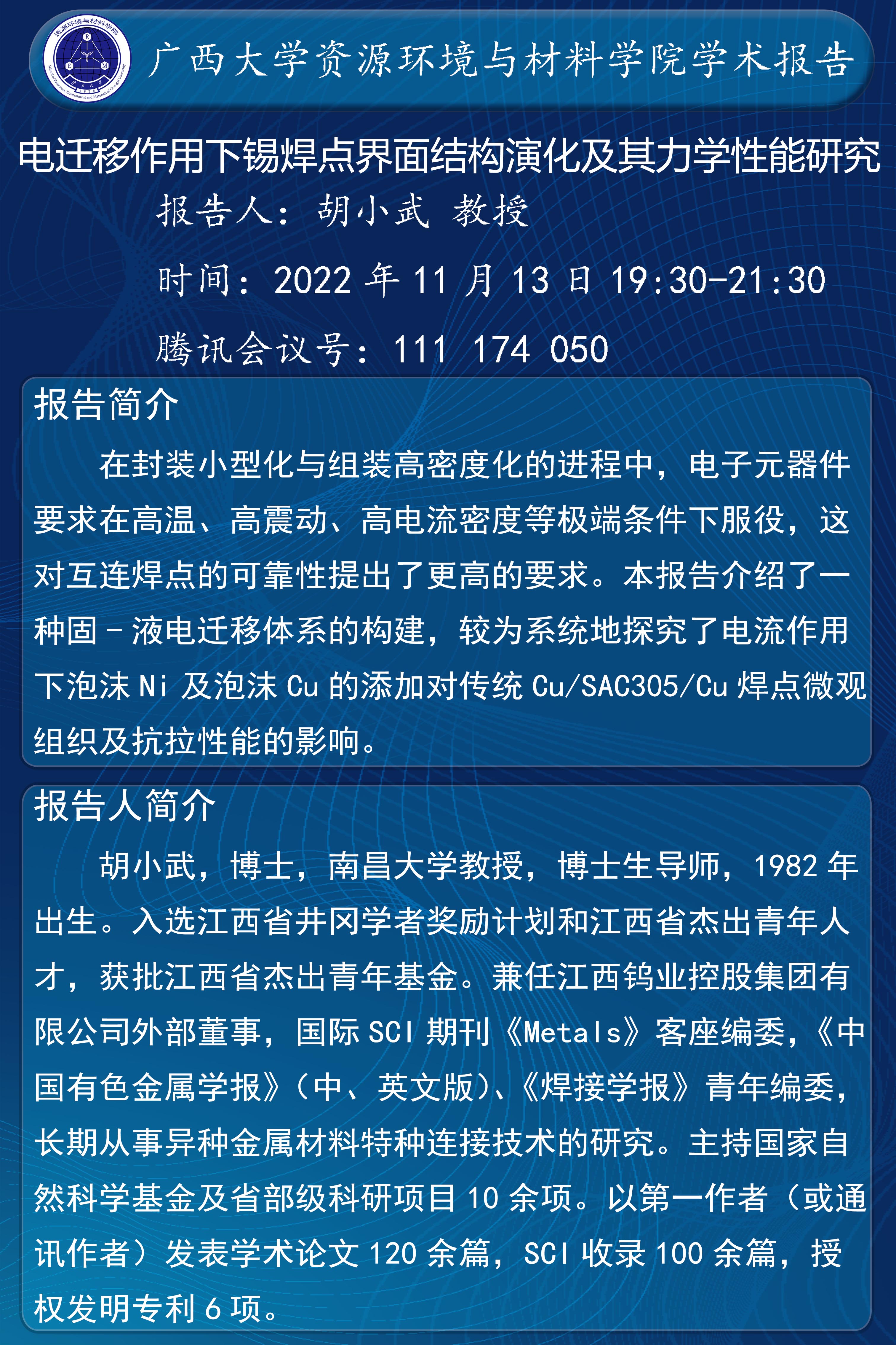 资源环境与材料学院学术报告:电迁移作用下锡焊点界面结构演化及其力学性能研究