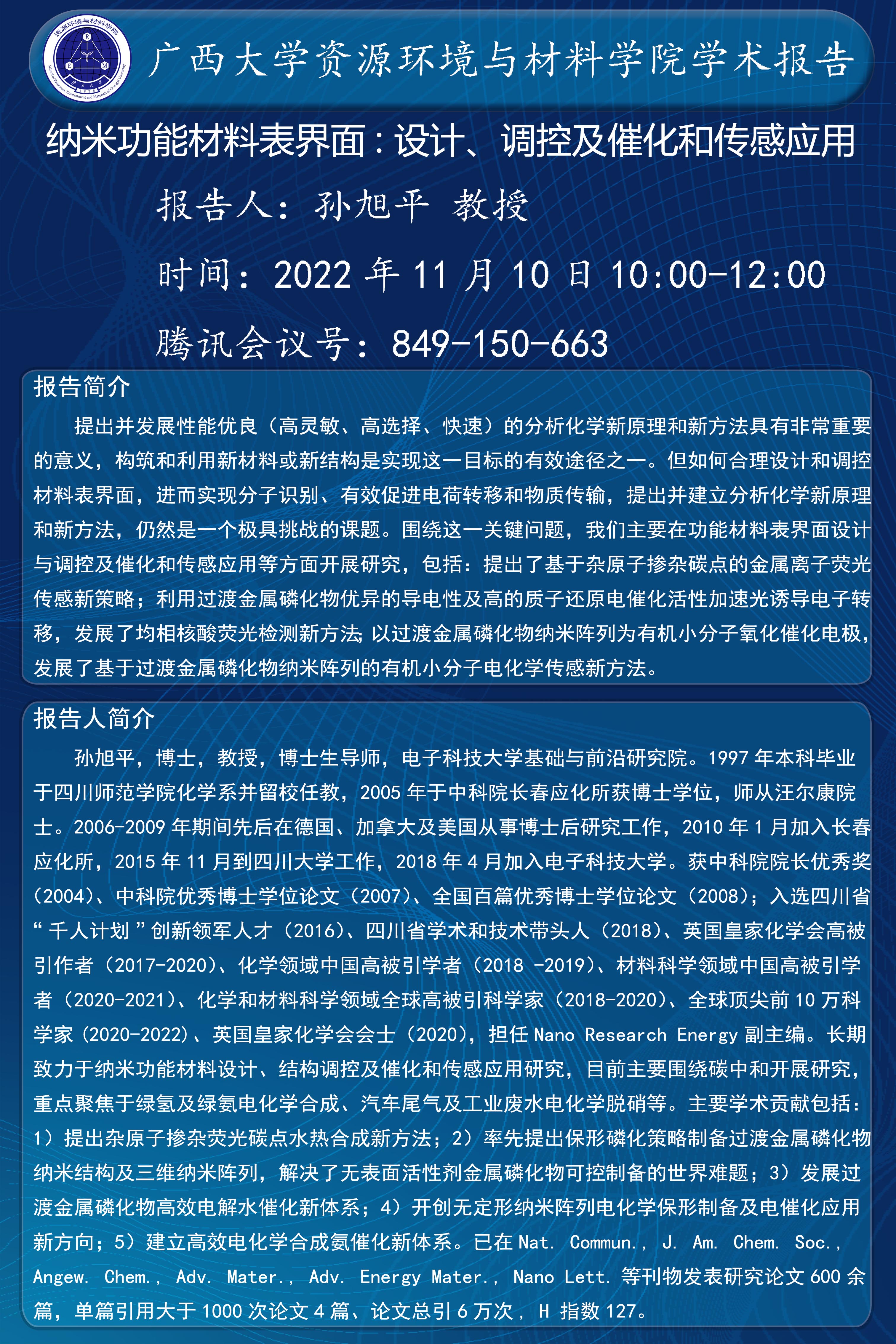 资源环境与材料学院学术报告纳米功能材料表界面: 设计、调控及催化和传感应用