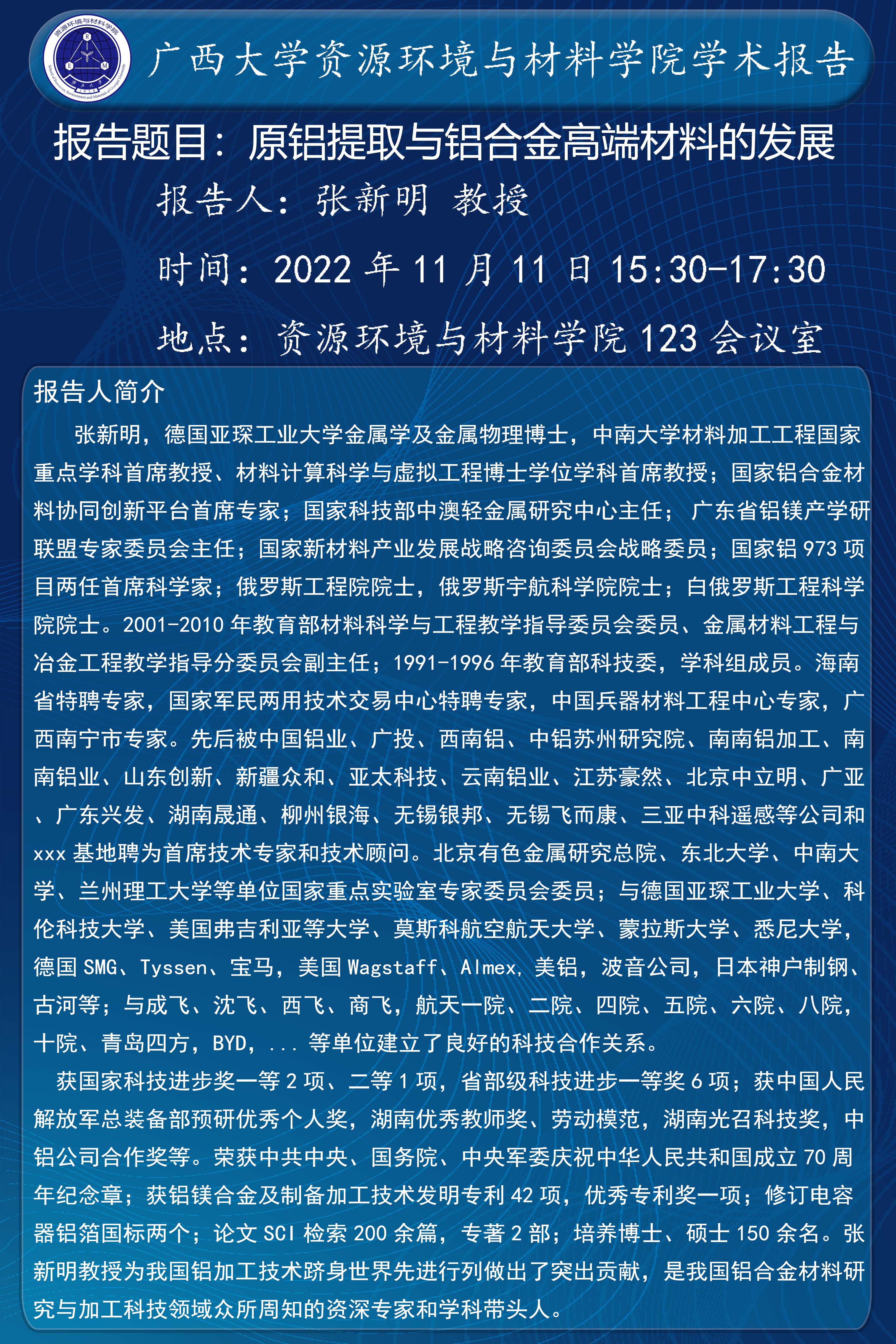 资源环境与材料学院学术报告:原铝提取与铝合金高端材料的发展