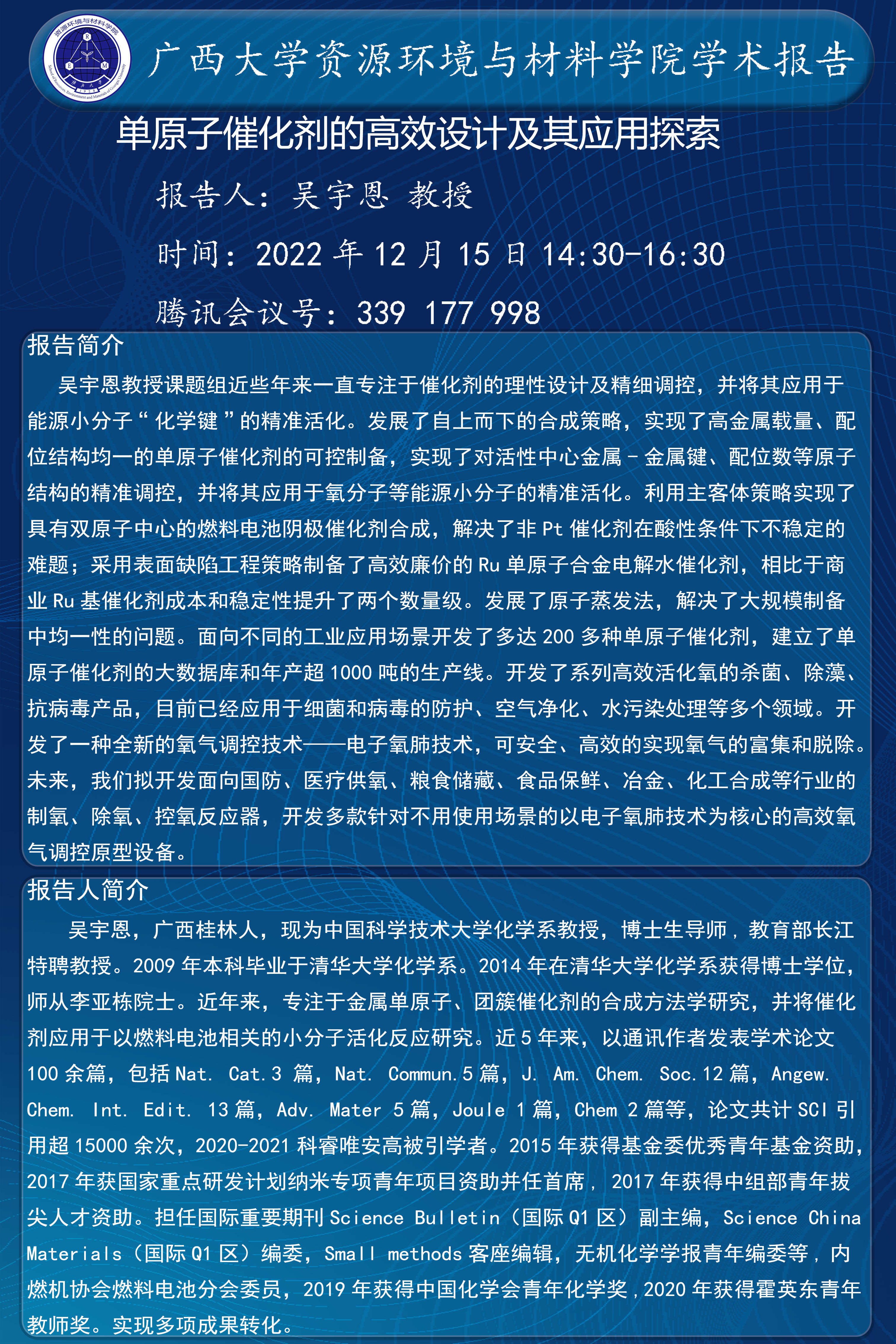资源环境与材料学院学术报告:单原子催化剂的高效设计及其应用探索