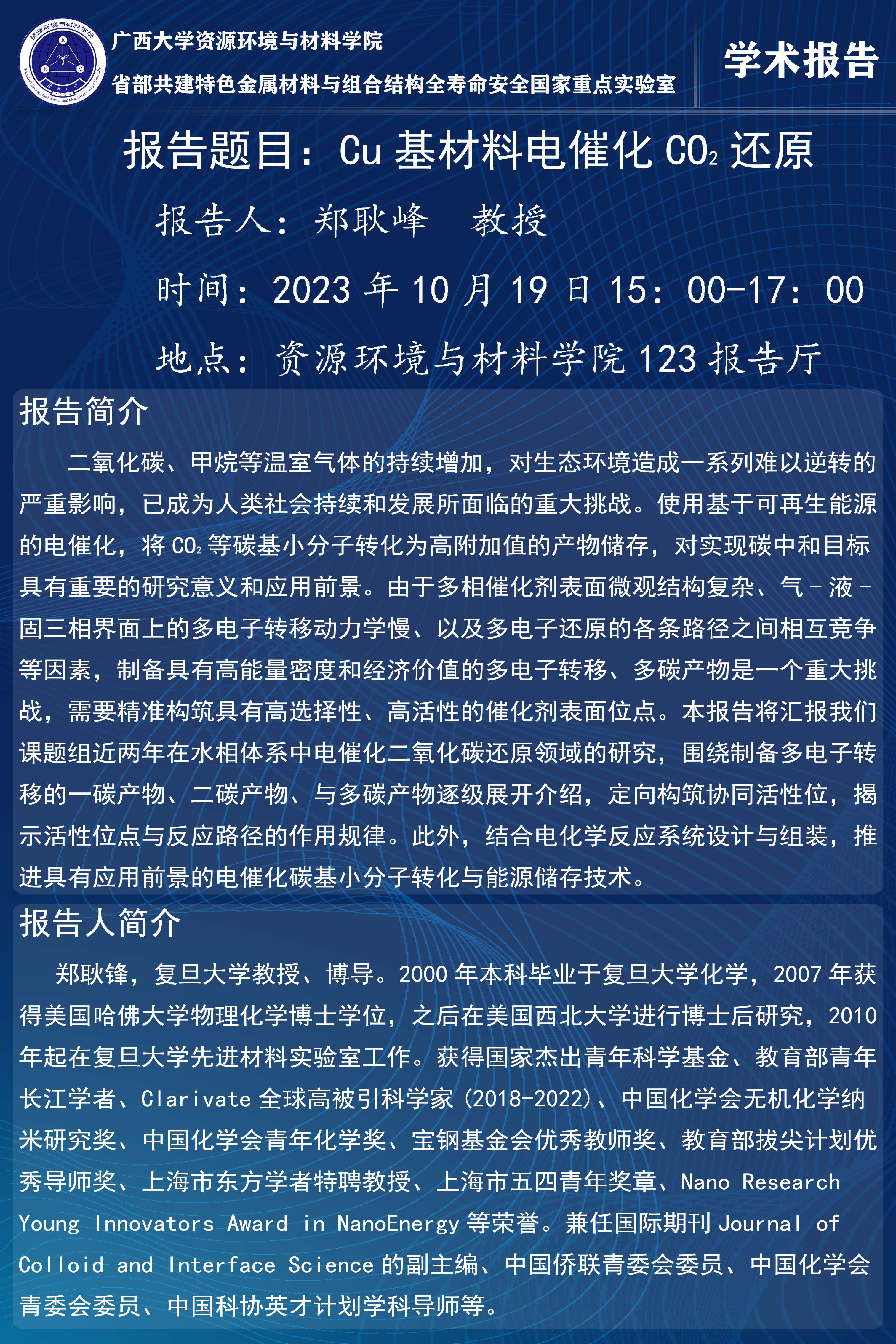资源环境与材料学院学术报告:Cu基材料电催化CO₂还原