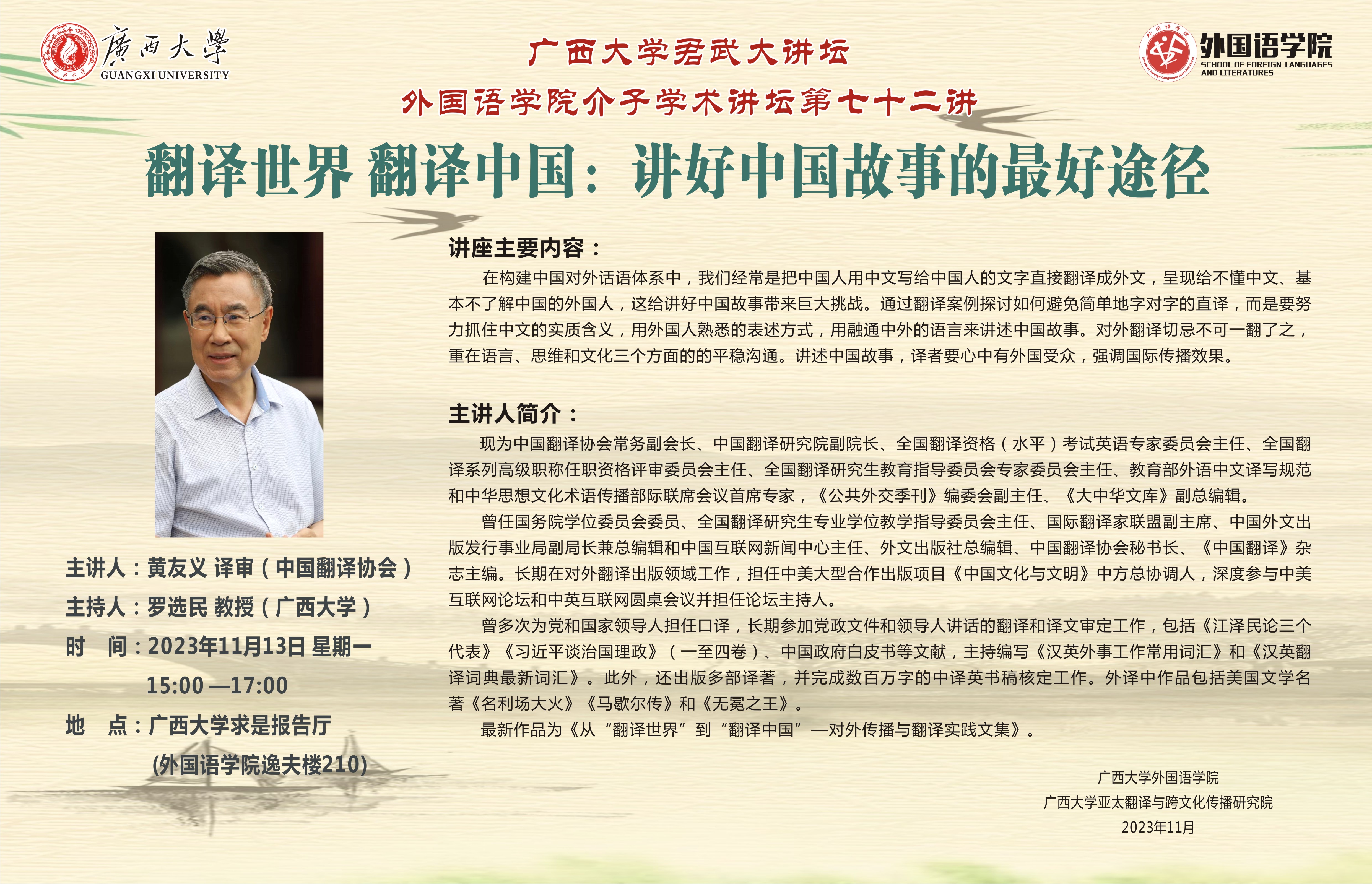 sunbet申搏官方网站君武大讲坛/外国语学院介子学术讲坛第七十二讲:翻译世界 翻译中国——讲好中国故事的最好途径