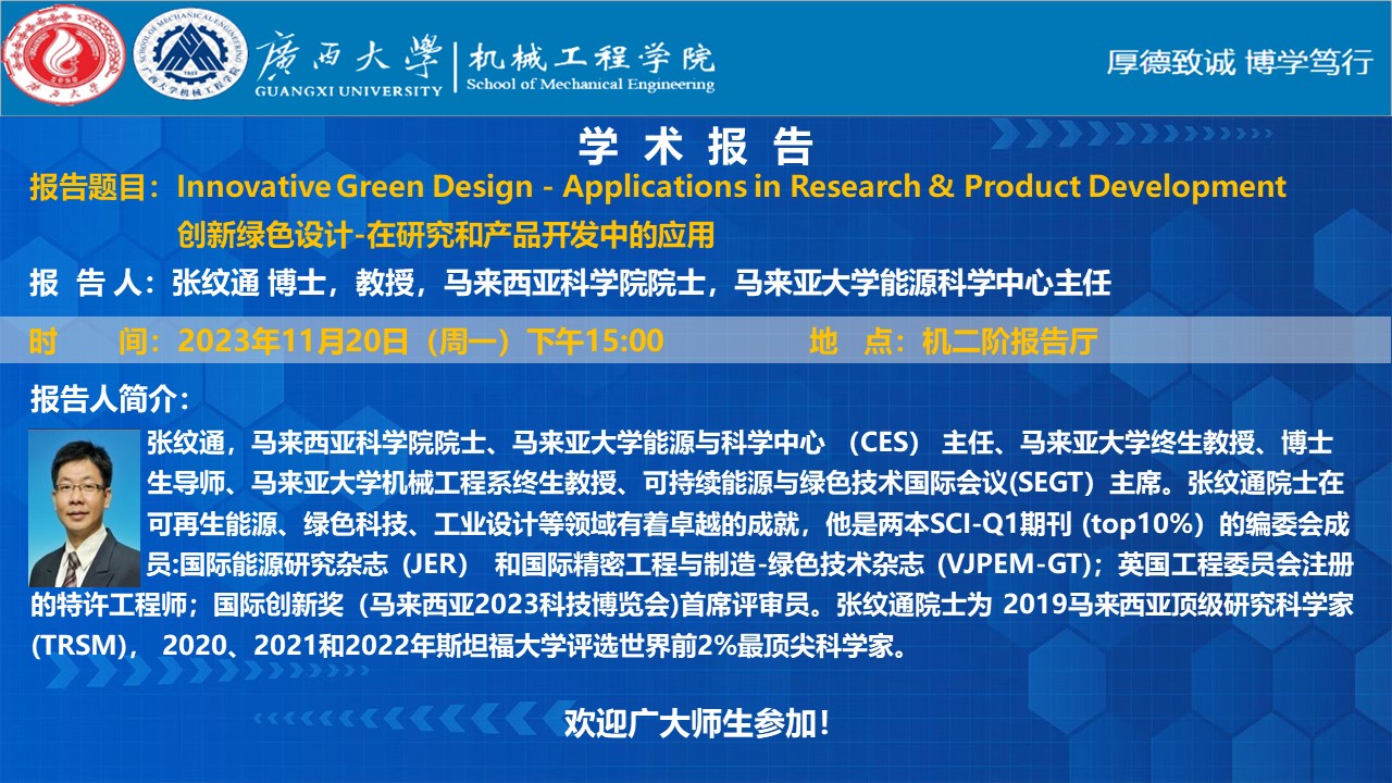 机械工程学院学术报告:Innovative Green Design - Applications in Research & Product Development 创新绿色设计-在研究和产品开发中的应用