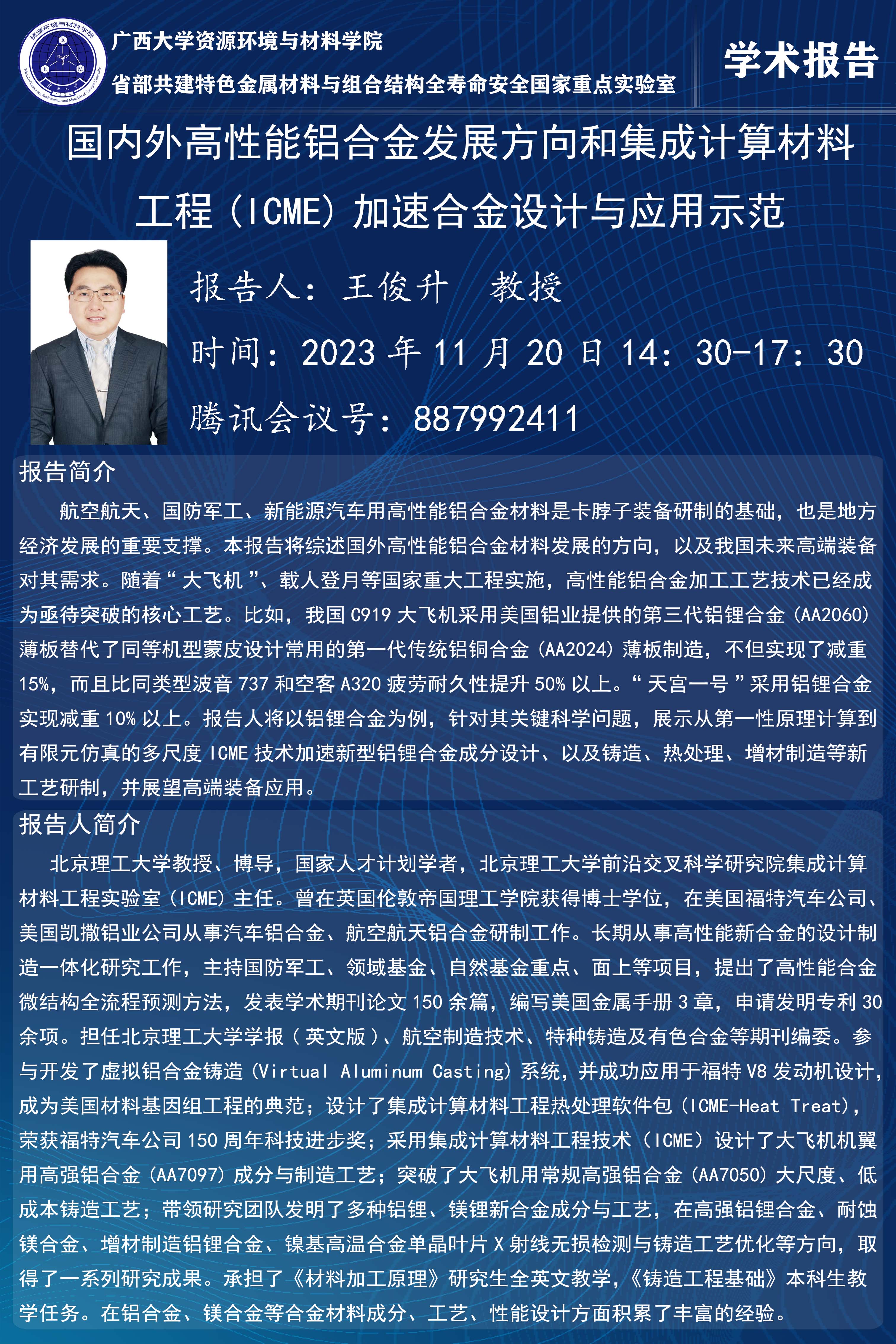 资源环境与材料学院学术报告:国内外高性能铝合金发展方向和集成计算材料工程(ICME)加速合金设计与应用示范