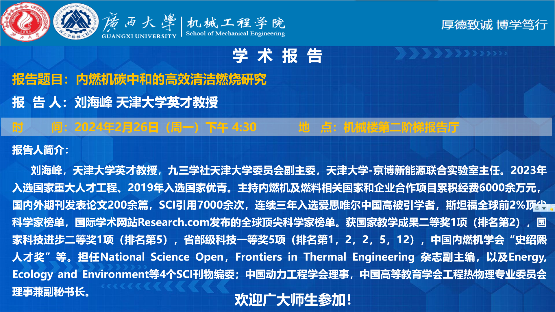 机械工程学院学术报告:内燃机碳中和的高效清洁燃烧研究
