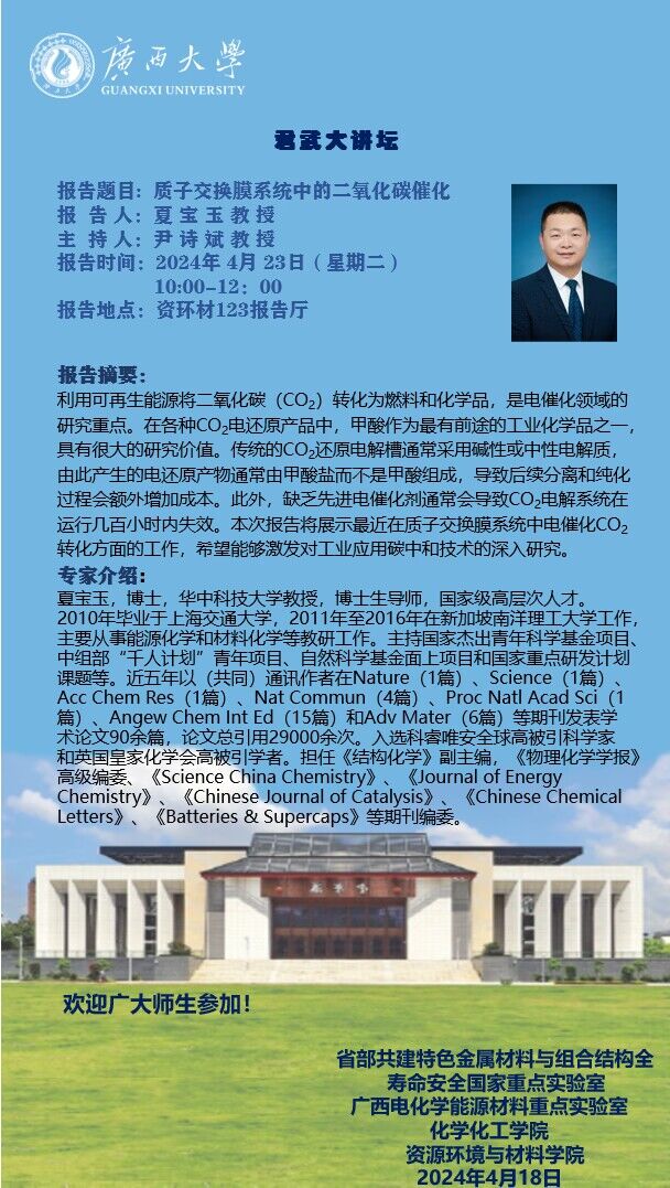 化学化工学院君武大讲坛:质子交换膜系统中的二氧化碳催化