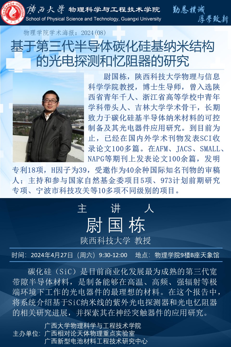 物理学院2024年学术报告之08:基于第三代半导体碳化硅基纳米结构的光电探测和忆阻器的研究