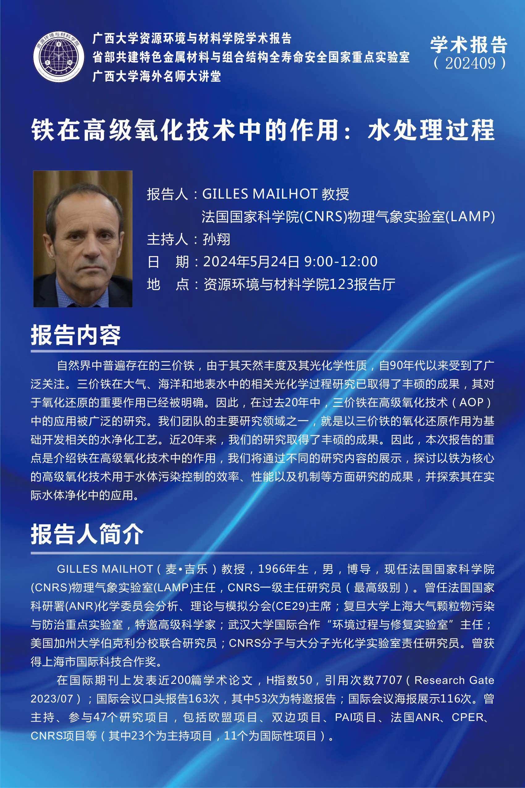 sunbet申搏官方网站海外名师大讲堂、资源环境与材料学院学术报告 :铁在高级氧化技术中的作用----水处理过程