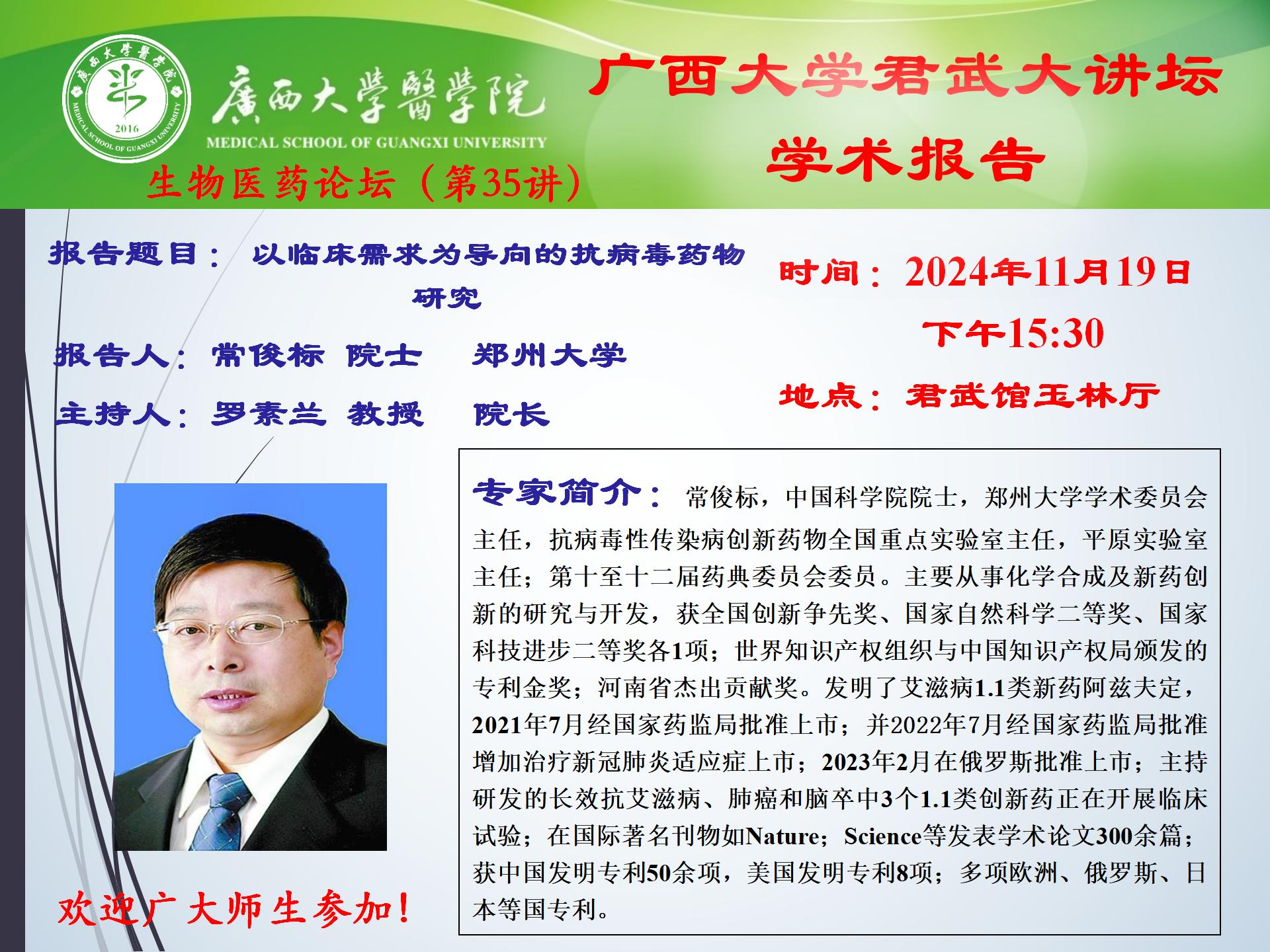 君武大讲坛、医学院学术报告:以临床需求为导向的抗病毒药物研究