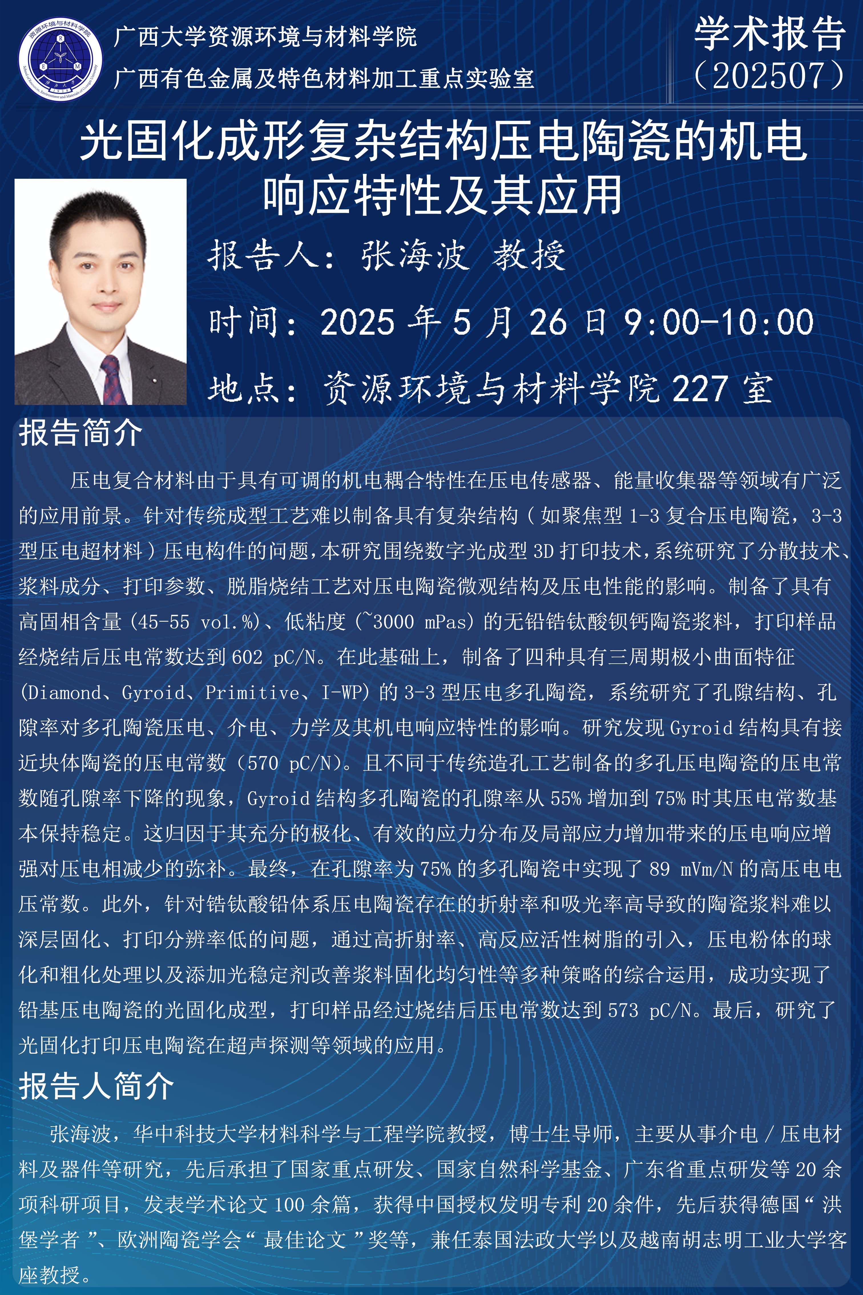 资源环境与材料学院学术报告:光固化成形复杂结构压电陶瓷的机电响应特性及其应用