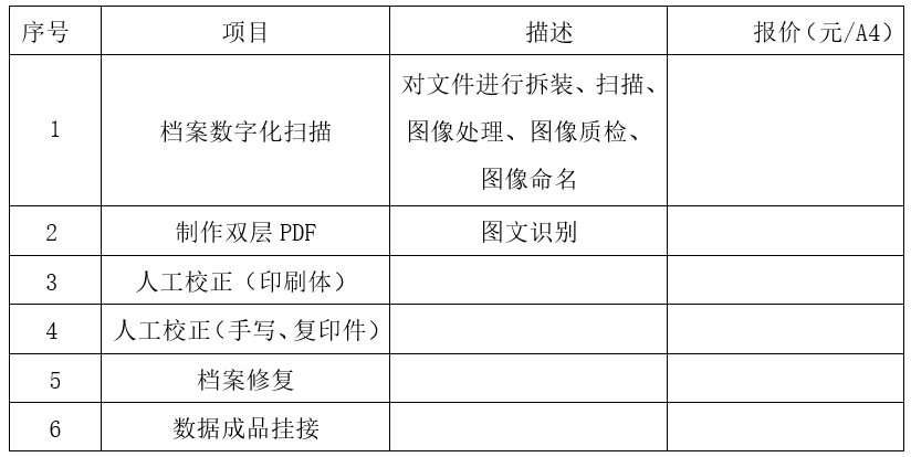 对档案扫描、制作双层PDF、人工矫正(印刷体、手写、复印件等)、挂接、档案修复等项目进行报价。