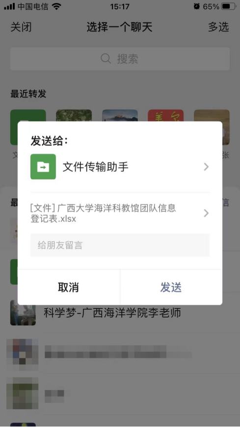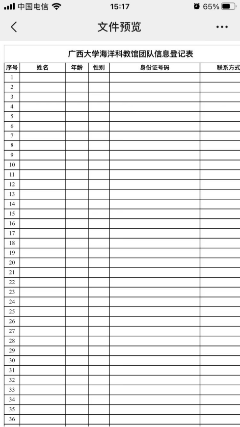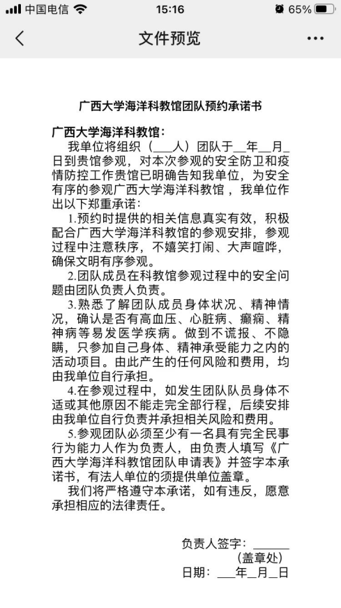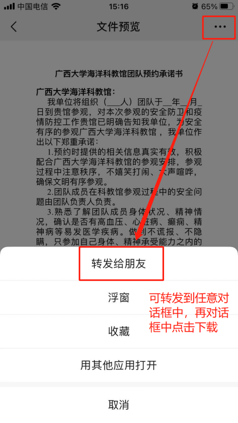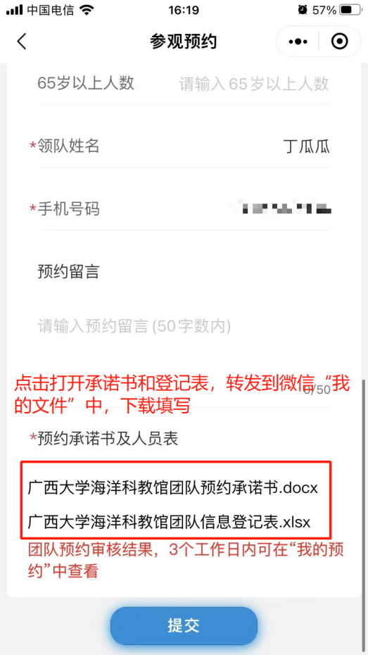 5. 预约申请提交后,可先准备团队预约承诺书和人员登记表,点击“sunbet申搏官方网站海洋科教馆团队预约承诺书”或“sunbet申搏官方网站海洋科教馆团队信息登记表”,转发至微信对话框中(推荐“文件传输助手”),下载后按要求填写预约承诺书和人员登记表内容,填写完成后发送给馆内工作人员,由工作人员审核。