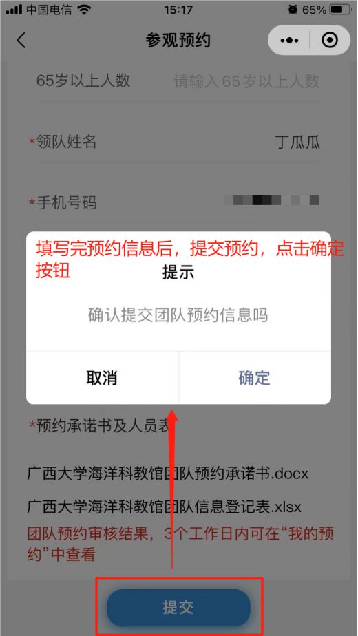 3. 预约界面选择参观日期,参观时段,填写预约信息(带星号的是必填项,不带星号的可选填)。