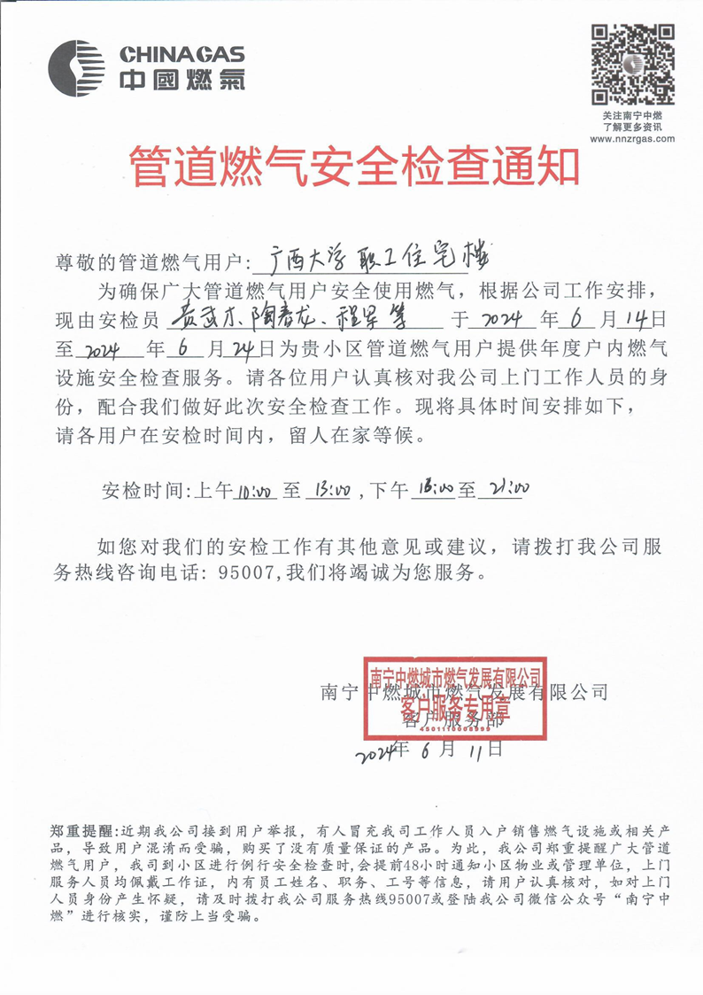 根据中国燃气发展有限公司《管道燃气安全检查的通知》精神(详见附件),将于2024年6月14日至6月24日进行入户燃气安全检查。为了更好的配合该公司开展工作,届时请各用户做好配合相关工作,现将具体通知如下: