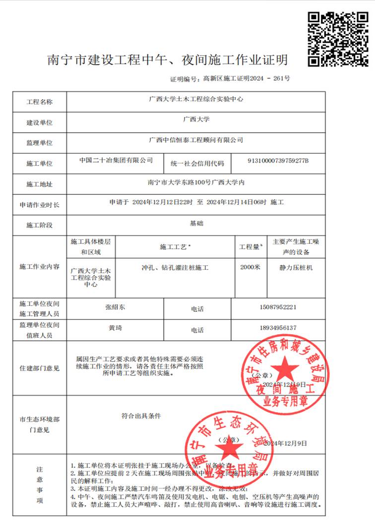 我单位承建的sunbet申搏官方网站土木工程综合实验中心项目因施工工艺需要,在符合法律许可的夜间施工条件之下,经南宁市住房和城乡建设局、南宁市生态环境局核准,计划于2024年12月12日22:00—2024年12月14日6:00进行静压桩施工。我单位将严格按照建设局、环保局要求,采取有效措施尽可能减少影响。施工期间可能会对广大师生员工的日常生活造成一定的干扰。对此,我们深表歉意,敬请谅解。